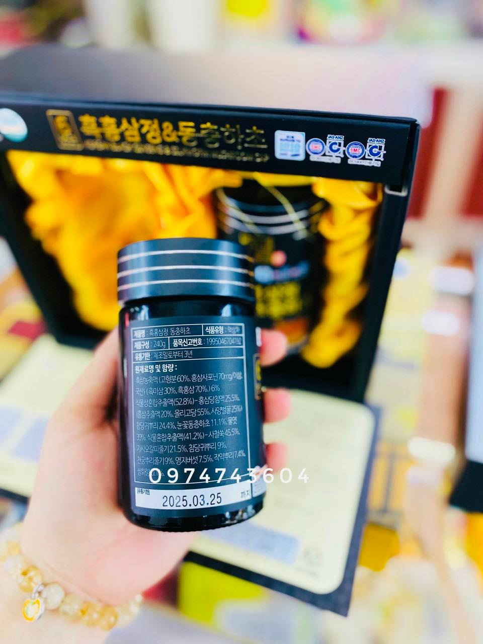 Thành phần: Hắc sâm, đông trùng hạ thảo kết hợp cùng các thảo dược quý hiếm như đương quy, hồng sâm, sáp ong, sâm Siberia, xuyên khung, bạch thược, nấm linh chi, nhân trần,… Công dụng: • Cao hắc sâm đông trùng hạ thảo chống mệt mỏi, tăng khả năng miễn dịch, tăng sức đề kháng cơ thể, duy trì chức năng làm việc bình thường của hệ thống thần kinh trung ương. • Cải thiện tình trạng mất ngủ, nâng cao sự tập trung và năng lực phân tích. • Cao hắc sâm đông trùng hạ thảo đặc biệt có hiệu quả cho những người cao tuổi, thể lực giảm sút, miễn dịch kém, suy giảm trí nhớ. • Bồi bổ toàn diện, tăng cường sinh lực, thúc đẩy tuần hoàn máu, thúc đẩy công năng của tuyến sinh dục nam và nữ. • Hỗ trợ giảm mỡ máu, phòng chống khối u, hỗ trợ điều hòa huyết áp, chống xơ cứng động mạch. • Tăng sức đề kháng, tốt cho gan thận và tăng khả năng miễn nhiễm. Giúp hưng phấn hệ thống tuyến yên, tuyến vỏ thượng thận. • Sáng da, làm cho làn da tươi sáng và hồng hào dần sau khi dùng… • Hồi phục nhanh cho bệnh nhân mới mổ, cao hắc sâm đông trùng hạ thảo rất tốt cho bệnh nhân đang điều trị bệnh. • Hỗ trợ làm đẹp da trong một thời gian ngắn sử dụng.