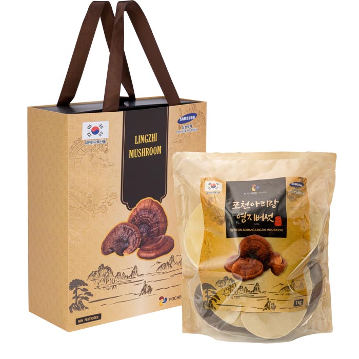 Ở Hàn Quốc, Nấm Linh chi được trồng và thu hoạch theo phương pháp truyền thống nên có chất lượng tuyệt hảo. Một trong số đó là Nấm Linh chi của hãng Pocheon Ginseng. Sản phẩm được dạng lá khô và chứa trong túi 1 kg; mỗi túi từ 10-13 lá, bao bì sang trọng đẹp mắt thích hợp để làm quà biếu tặng dành gửi đến những người thân yêu trong gia đình để tăng cường nâng cao sức khỏe và phòng ngừa bệnh tật.